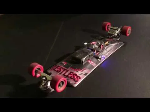 The electrical/mechanical system configuration is almost identical to V1, except V2 has two motors for twice as much torque. As a result, twice as much electrical power is needed to run the longboard at its full potential. Four 5-cell, 5000 mAh, 25C LiPo batteries are connected in series+parallel configuration to produce a 37 Volt, 10 Amp-hour power source. The same wireless controller and receiver are used to send throttle commands to a bigger ESC, which delivers power to two wheels with a 15:44 motor-to-wheel gear ratio. With an unsafe theoretical max speed of 36 mph, it was important to adjust the ESC’s settings to limit max power and top speed.