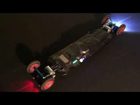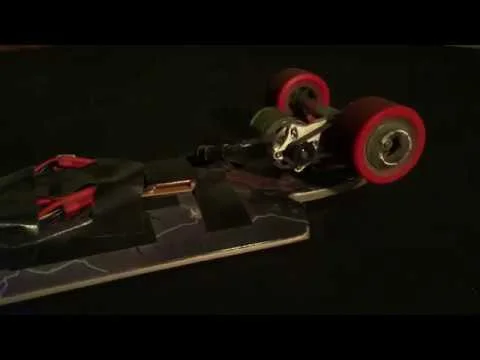 Wanting to get around campus more quickly than walking afforded, I set out to build an electric longboard. Relative to a standard skateboard, a longboard provided additional stability, while also giving extra room on the bottom for electronics. Two 4-cell, 5000 mAh, 25C LiPo batteries are in series providing energy to the entire system. Power transfers from the batteries to the electric motor via the electronic speed controller (ESC), which takes input signals from the wireless receiver and outputs electrical power to the 3-phase outrunner motor. The wireless receiver is powered by a 5V regulator coming off the batteries and receives signals from a wireless Wii nunchuck controller. The motor drives trapezoidal-groove timing pulleys with a 14:32 motor-to-wheel gear ratio.