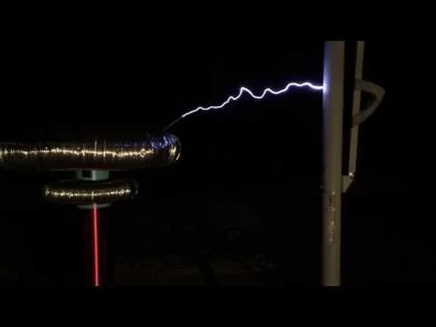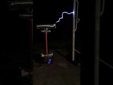 The primary inductor-capacitor circuit (copper tube spiral and white capacitor bank underneath) is physically tuned to have a resonant frequency close to the non-adjustable resonant frequency of the secondary inductor-capacitor circuit (the red shiny wire and aluminum toroids on top) to maximize efficiency of energy transfer. The primary's resonant frequency is electronically detected and used to send pulses of energy into the system at that frequency (approximately 67 kHz in this case), building up energy with every cycle until it is dissipated as an electric arc.