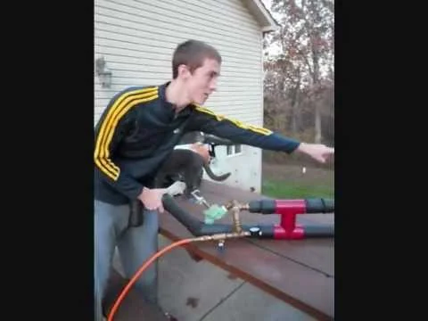 Not satisfied with the strength of the golfball gun, I sought to make an even more powerful projectile cannon and came across hybrid guns. The word hybrid refers to how the gun utilizes compression and combustion to launch a projectile by igniting a pressurized fuel/air mixture. The golfball gun uses only compression, and standard aerosol spud guns use only combustion. Hybrid guns of this size can have firepower similar to actual rifles.