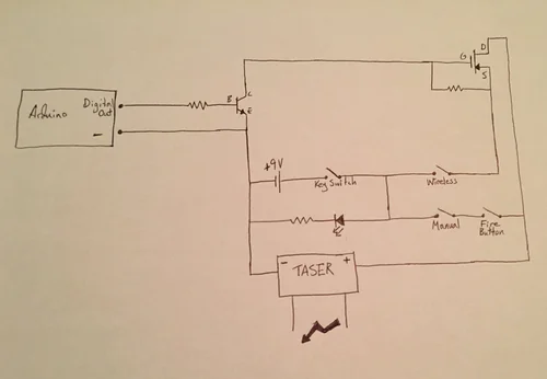 The wireless capability provided by the Arduino and its Bluetooth shield were put in a separate connectable project box to keep the main box smaller when wireless operation was not desired. In an ironic twist, wireless operation became always necessary due to a physical design flaw. As can be seen in the pictures to the right, the red manual firing button was mistakenly placed at the top of the box in between several thousands of volts of potential of the taser's electrodes. If the electrodes were not very close together during testing, pressing the fire button would send an internal spark to the button's terminals. The fire button was disconnected and insulated from the rest of the system.